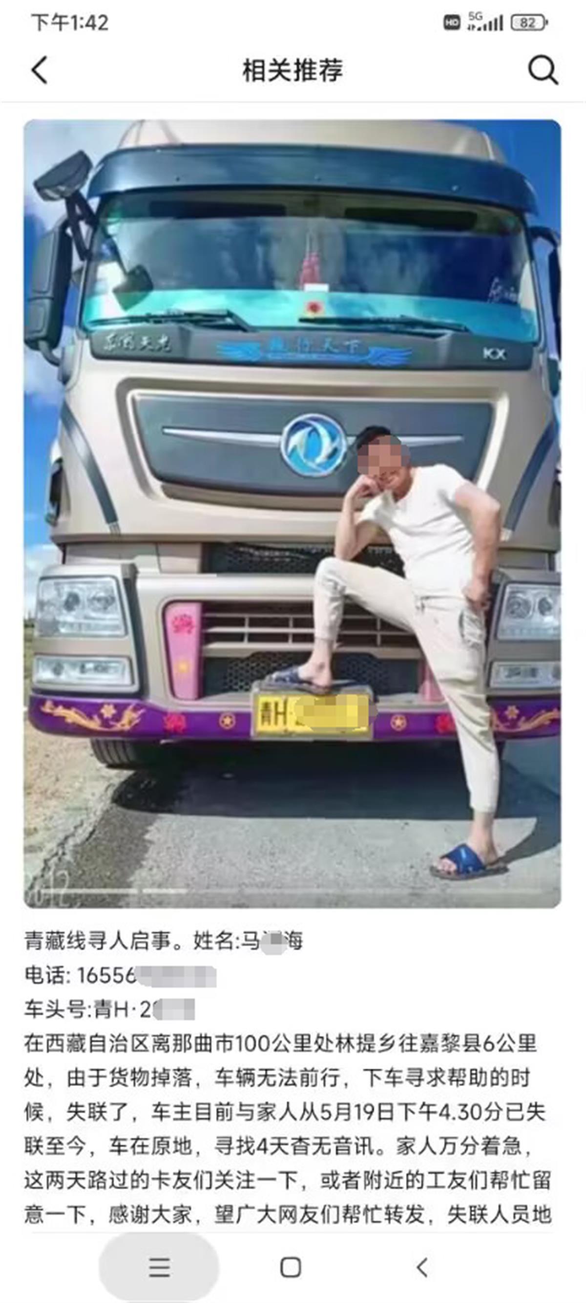 5月23日,马某海的弟弟马先生告诉极目新闻记者,马某海是青海民和县人,是一名平板车司机,在西藏、青海地区从事货车运输已有十多年。5月20日早上6时许,他们接到哥哥货主的电话,称马某海的车子停在西藏305省道那曲市嘉黎县林提乡段的路上,人却失去了联系。