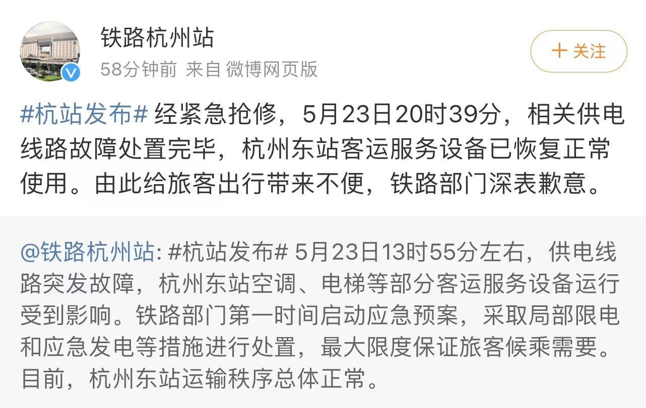 据“铁路杭州站”消息,经紧急抢修,5月23日20时39分,相关供电线路故障处置完毕,杭州东站客运服务设备已恢复正常使用。