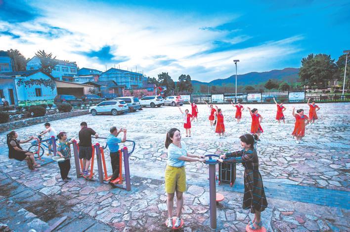 传统村落红安县柏林寺村休闲广场上,跳广场舞和纳凉健身的村民。(湖北日报全媒记者 朱熙勇 摄)