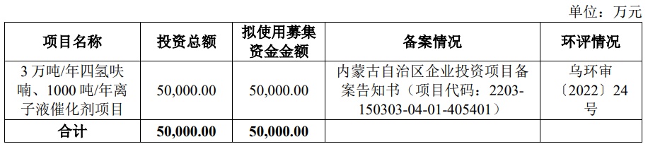美邦科技于2023年5月9日披露的招股说明书显示,该公司拟募集资金50,000.00万元,用于3万吨/年四氢呋喃、1000吨/年离子液催化剂项目。