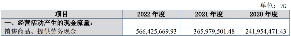 上述同期,公司销售商品、提供劳务现金分别为241,954,471.43元、365,979,501.48元、566,425,669.93元;经营活动产生的现金流量净额分别为57,410,893.60元、47,127,955.77元、191,496,900.62元。