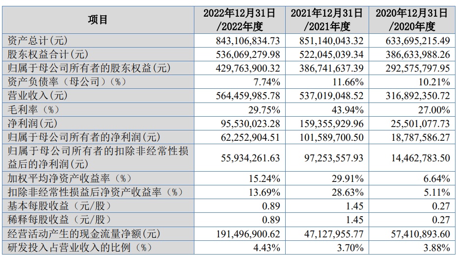 2020年至2022年,美邦科技的营业收入分别为316,892,350.72元、537,019,048.52元、564,459,985.78元;净利润分别为25,501,077.73元、159,355,929.96元、95,530,023.28元;归属于母公司所有者的净利润分别为18,787,586.27元、101,589,700.50元、62,252,904.51元;归属于母公司所有者的扣非净利润分别为14,462,783.50元、97,253,557.93元、55,934,261.63元。