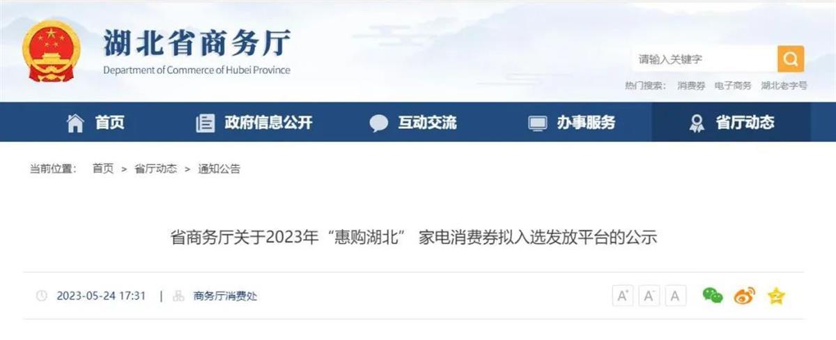 5月24日,湖北省商务厅发布《关于2023年“惠购湖北” 家电消费券拟入选发放平台的公示》。