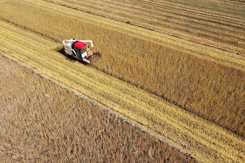 在保康县马桥镇中坪村,农民驾驶收割机收割小麦。