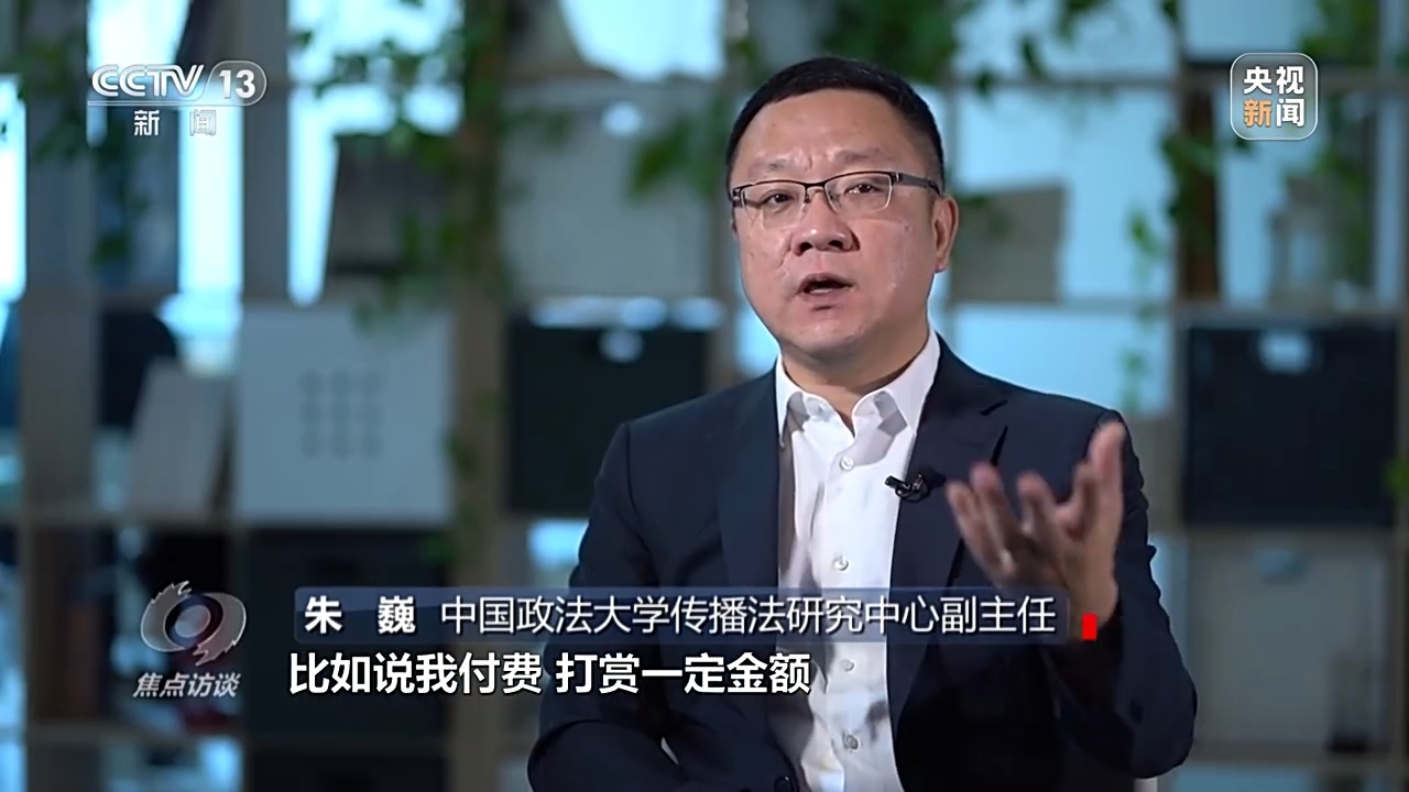 中国政法大学传播法研究中心副主任 朱巍:因为打赏有不同的类别,有一种付费观看,比如我付费,打赏一定金额,主播会回答你一个问题,或者给你讲一个故事,唱一首歌,跳一支舞。属于这种附条件的赠与,或者类似于购买服务。