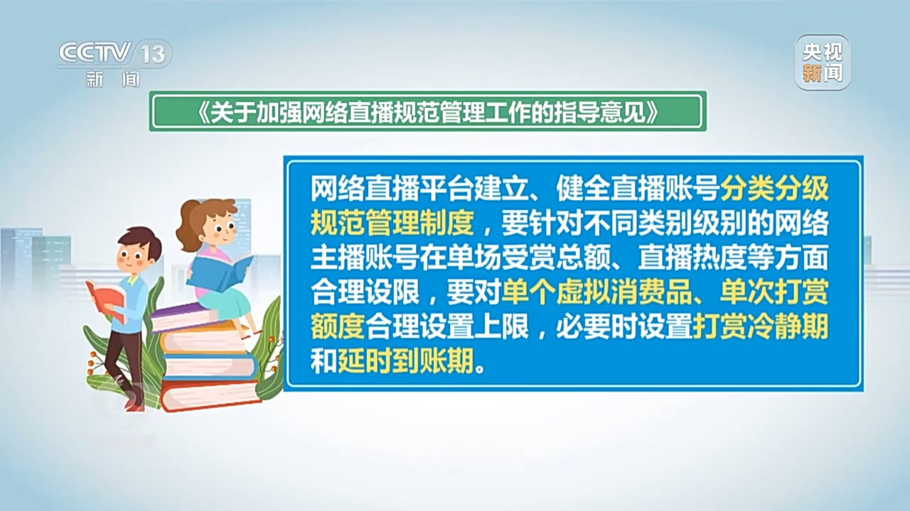 根据行业管理的要求,2021年我国《关于加强网络直播规范管理工作的指导意见》中就提出,网络直播平台建立、健全直播账号分类分级规范管理制度,要针对不同类别级别的网络主播账号在单场受赏总额、直播热度等方面合理设限,要对单个虚拟消费品、单次打赏额度合理设置上限,必要时设置打赏冷静期和延时到账期。时隔两年多的时间,这些要求一些平台并没有落实。