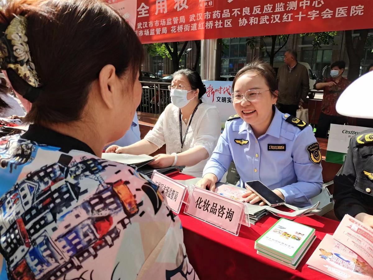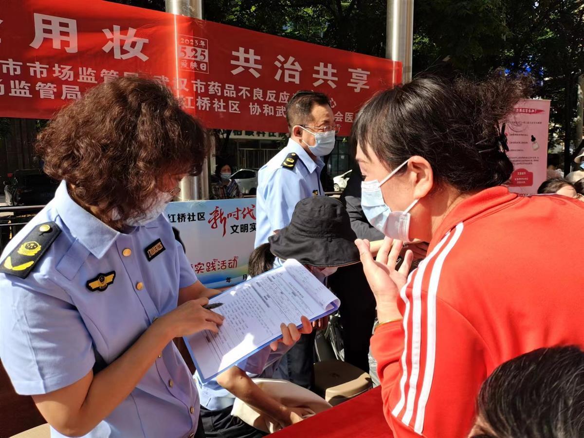 5月25日是爱肤日。武汉市市场监管局、武汉市药品不良反应监测中心联合江岸区市场监管局,在武汉江岸区花桥街道红桥社区升旗广场举行了“5·25爱肤日”科普宣传活动,为居民科普健康理念。