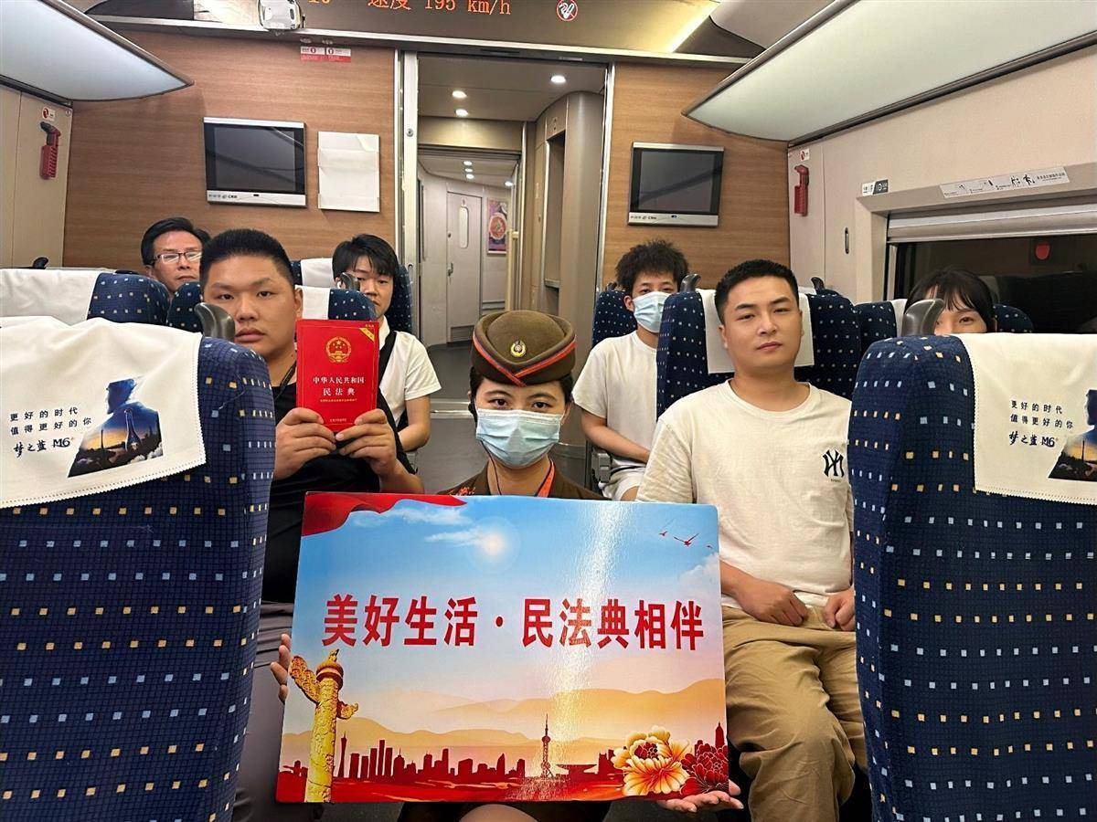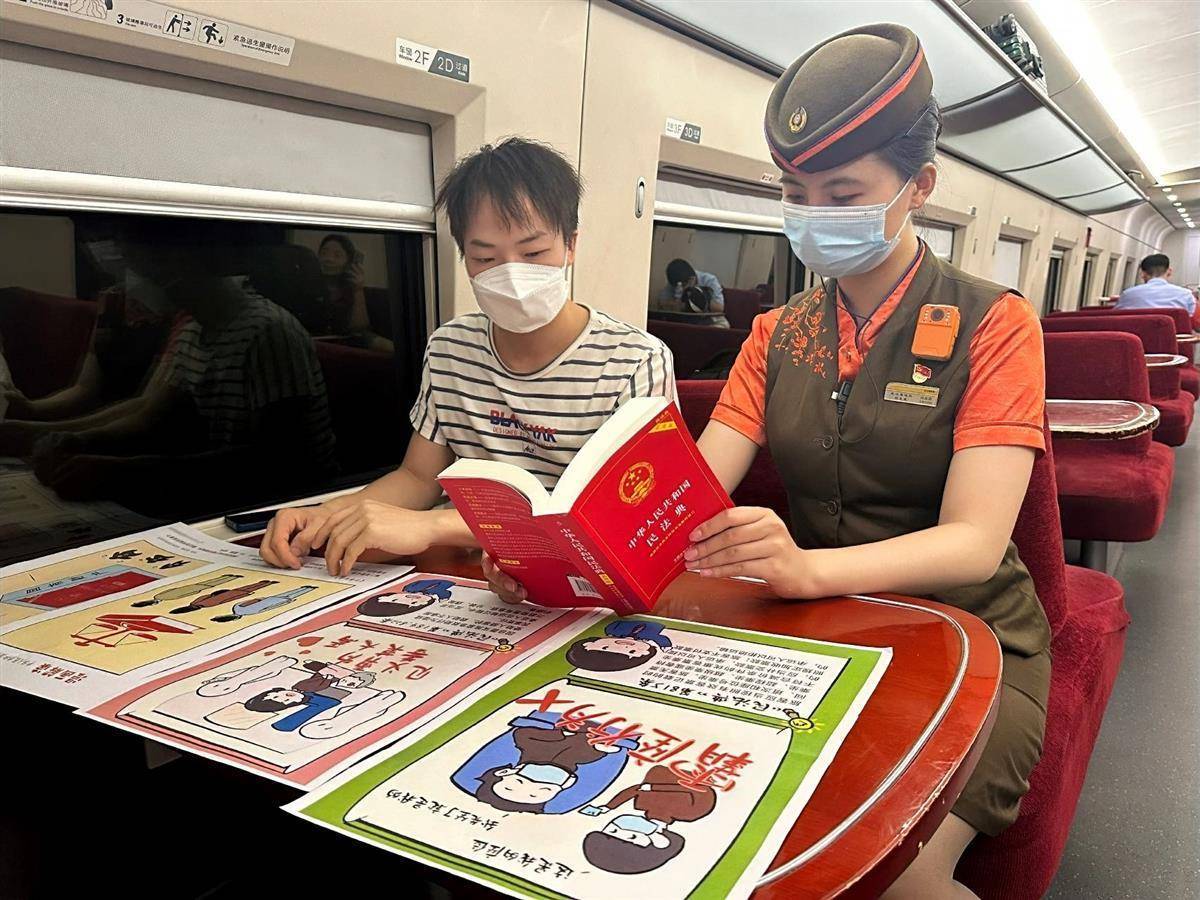 湖北日报讯(通讯员刘琼、黄洁)5月28日,武汉铁路局武汉客运段在宜昌东开往深圳北的G1034次列车上,开展了以“美好生活·民法典相伴”为主题的普法宣传活动,通过给广大旅客进行普法宣传,让大家知法、守法、用法、懂法,让《中华人民共和国民法典》真正走到大家身边,走进大家心里,真正成为大家的“社会生活百科全书”,一起用法律维护良好的社会秩序。