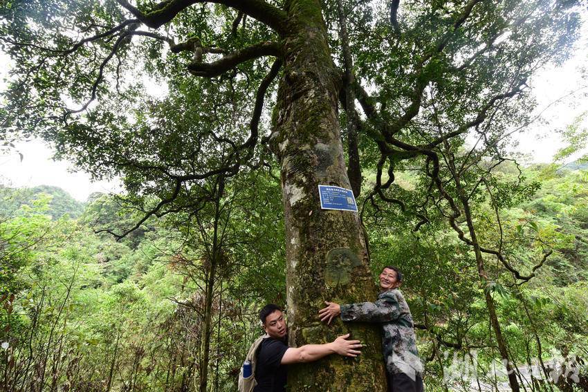 古树生长在幽谷之中,侧立于悬崖之上,树高约20米,冠径约15米,胸围需两人合抱。