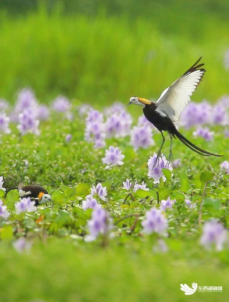 “第一次见到水凤凰群落,还是在5月初的府河北岸。”夏候鸟水雉是国家二级重点保护鸟类,原生在热带及亚热带开放性湿地中,夏季北上寻觅栖息地繁殖。在东西湖境内发现水雉群落,周东泉格外兴奋。