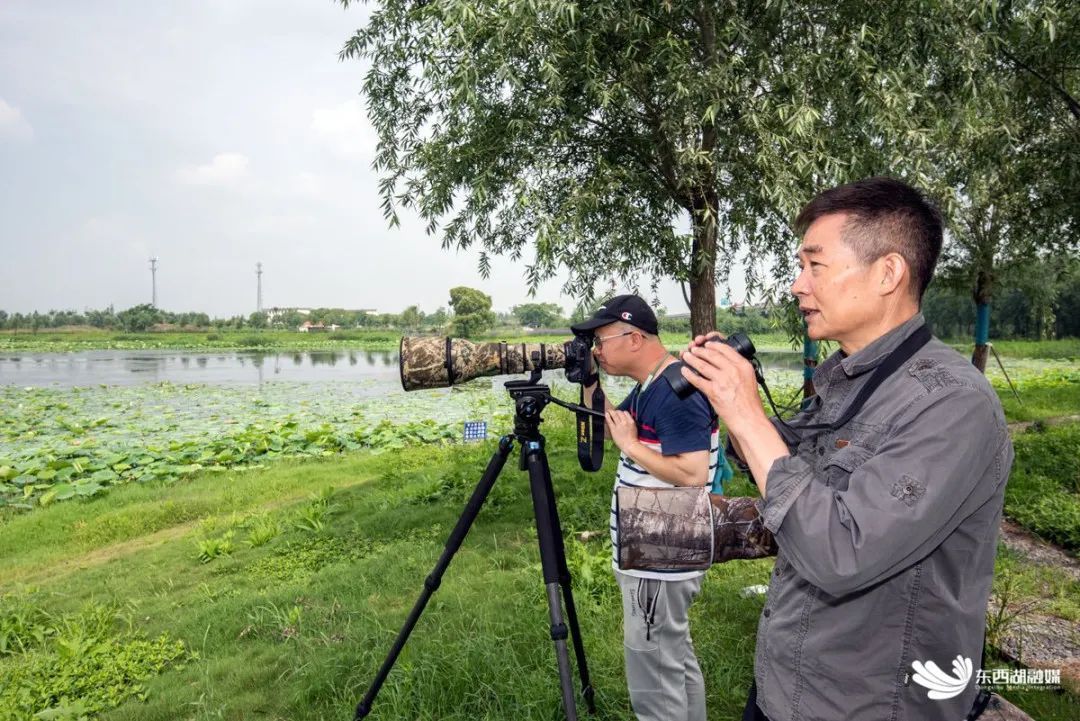 周东泉(右)与观鸟伙伴远距离观察水雉