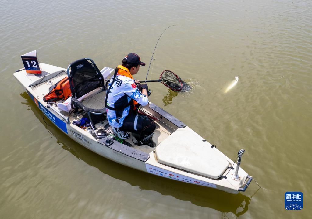 5月27日,刘天迪在比赛中中鱼后抄网(无人机照片)。