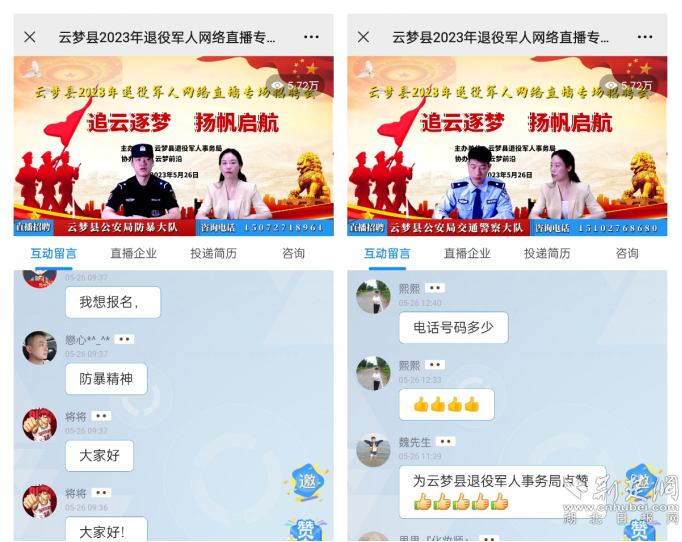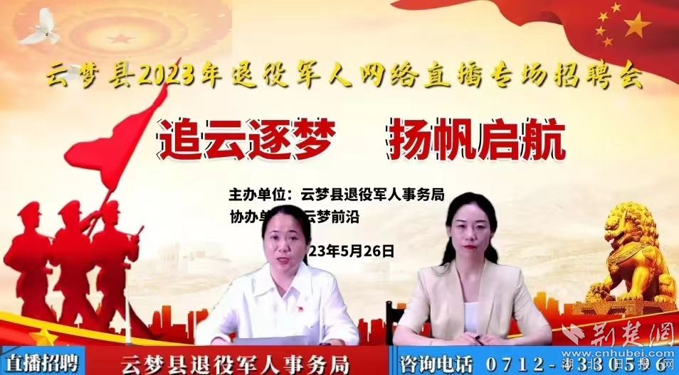 荆楚网(湖北日报网)讯(通讯员邹晶)5月26日上午,云梦县退役军人事务局联合云梦前沿组织开展“追云逐梦 扬帆起航”2023年退役军人网络直播专场招聘会活动,为用人单位和退役军人搭建择业供需平台。