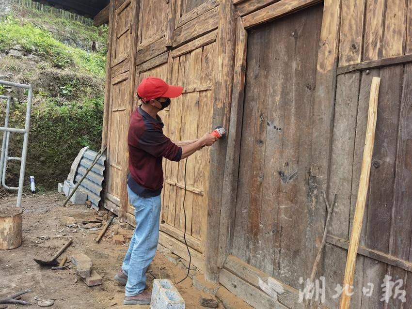 公区义务工结束后,大家又马上开始倒饬自家房前屋后。向洪波帮忙把叔叔家的废猪圈拆了后,拿起砂轮,继续打磨叔叔的木房子。他叔叔向兴建常年在外打工,其老屋就在院子入口处,听说院子里正在搞环境整治,特意委托侄儿,全权代为处理自家老屋周边环境整治。经过向洪波的细心打磨,黑黝黝的老木屋,逐渐露出黄灿灿的土家木屋本色。