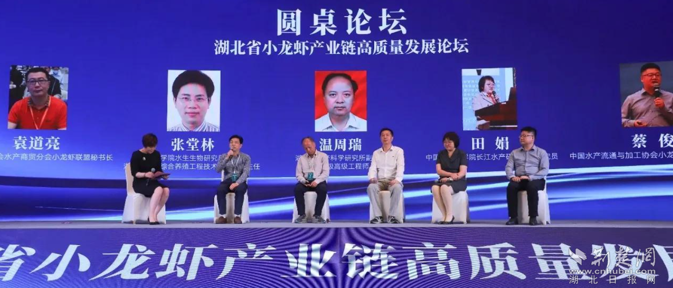 最后,本次活动的“圆桌论坛”环节,邀请了湖北省水产科学研究所所长温周瑞,中国科学院水生生物研究所研究员张堂林,中国水产科学研究院长江水产研究所副研究员田娟,中国水产流通与加工协会小龙虾产业分会秘书长蔡俊,以及中国渔业协会水产商贸分会小龙虾联盟秘书长袁道亮分别就“养殖模式与技术”“虾苗繁育管理”“饲料的选择与投喂管理”“高值化加工与利用”“冷链物流及品牌创建”等议题与参会人员进行了交流分享。
