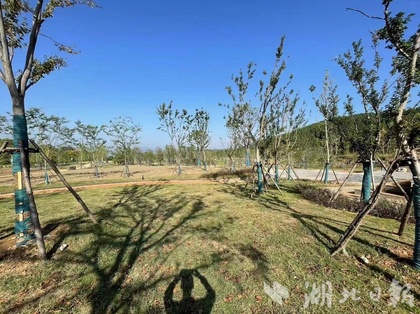 “该公园位于惠亭湖湿地公园核心区,北倚惠亭山,南傍惠亭湖畔,布局上分为管理服务、湿地和花海三大区块,设计上以山的轮廓、水的流线为元素,引入生态修复、海绵城市等技术亮点,选用透水铺装、雨水湿地、植草沟、下沉式绿地、多功能调蓄等低影响开发设施及其组合系统,目前停车场苗木已栽植完成。”京山市温泉街道项目办负责人张徐刚说道。