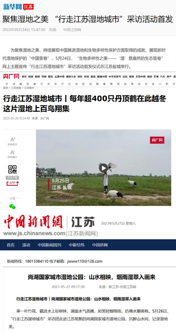 5月24日-5月27日,“生物多样性之美——‘湿’意盎然的生态答卷”网上主题宣传“行走江苏湿地城市”活动采访团走进盐城、常熟,来自全国各地的20多名编辑记者、网络达人、拍客代表观鸟寻鹿,在芦苇荡、池杉林中泛舟而过,用文字和镜头记录下江苏在湿地与生物多样性保护方面取得的巨大成就。