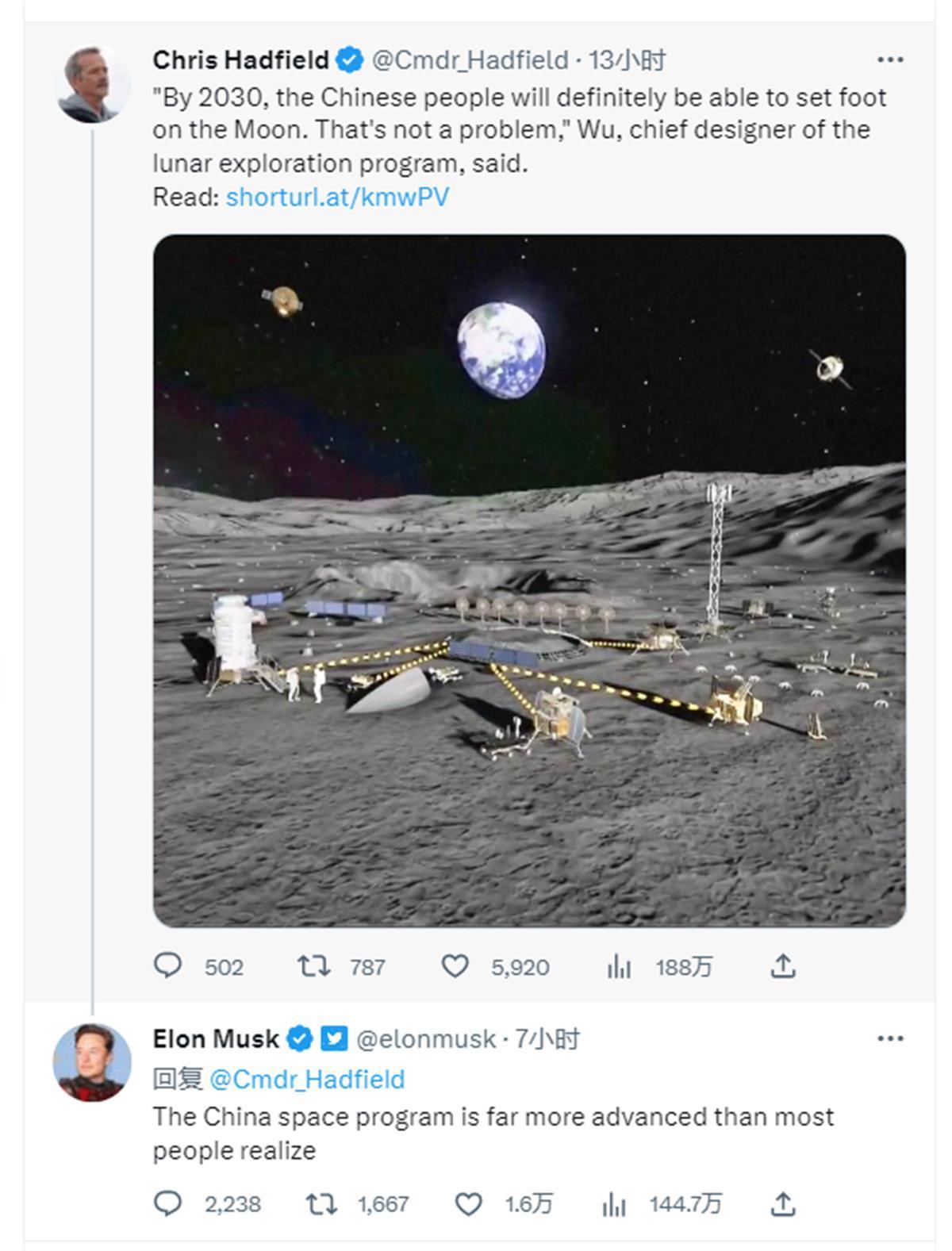 哈德菲尔德发布推文后,马斯克在下面回复说:“中国航天的计划比大多数人以为的更加超前,更强大。”