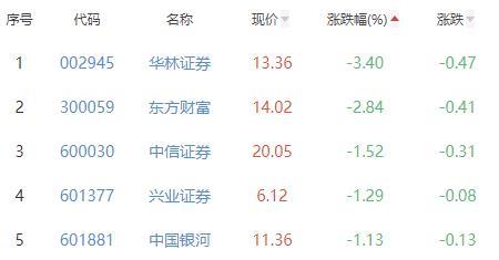 华林证券、东方财富、中信证券、兴业证券、中国银河位列涨幅榜后五位,涨幅分别为-3.40%、-2.84%、-1.52%、-1.29%、-1.13%。