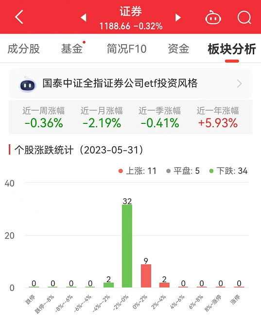 中国经济网北京5月31日讯 今日,证券板块整体跌幅0.32%,其中,11只股票上涨,5只股票平盘,34只股票下跌。