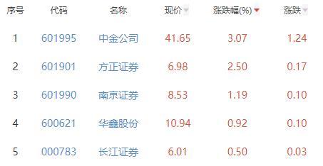 其中,中金公司、方正证券、南京证券、华鑫股份、长江证券位列板块涨幅前五位,涨幅分别为3.07%、2.50%、1.19%、0.92%、0.50%。