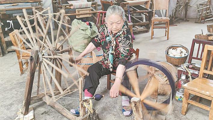 说话间,一根根经纬线已慢慢变成印有花纹的土布。这时需新材料,年过七旬的倪珍云下了织机,一路小跑到储物柜前,大步攀上近一米高板凳,取材后再一跃而下,往返于织机和储物柜间,一路“小跑”。