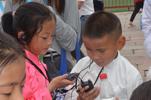 图为参加活动的青少年在操作讲解器。索朗旺堆 摄