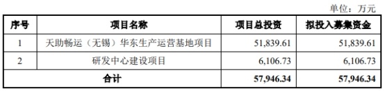 招股书显示,天助畅运拟募集资金57,946.34万元,分别用于天助畅运(无锡)华东生产运营基地项目、研发中心建设项目。