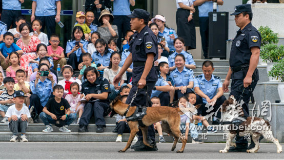 上午九点,活动在无人机列队表演中拉开了序幕。小朋友们通过无人机视角,从高空俯瞰京山全貌,随后,交警一中队骑警队展示了交通手势指挥表演和警务摩托车骑行表演,巡特警队员进行特警战术表演,警犬训导员带领警犬上场展示了服从和搜寻科目,民警展示单警装备、警用盾牌、武器警械等警务器械。一场场特色表演,引得在场萌娃们惊呼不断,掌声不绝,直呼看得不过瘾!