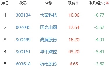 大富科技、国光电器、高澜股份、华中数控、杭电股份位列涨幅榜后五位,涨幅分别为-6.77%、-5.67%、-4.01%、-3.81%、-3.62%。