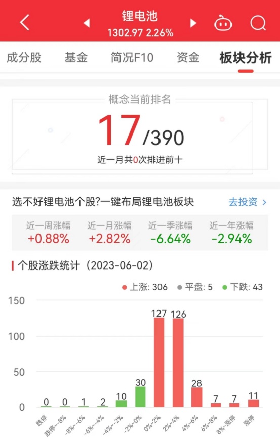中国经济网北京6月2日讯 今日,锂电池板块整体涨幅2.26%,其中306只股票上涨,5只股票平盘,43只股票下跌。