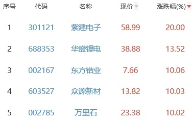其中,紫建电子、华盛锂电、东方锆业、众源新材、万里石位列板块涨幅前五位,涨幅分别为20.00%、13.52%、10.06%、10.03%、10.02%。