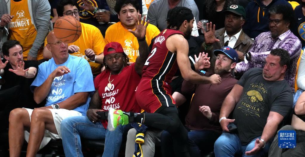 6月1日,热火队球员盖布·文森特(中)在比赛中冲入观众席救球。新华社记者 吴晓凌 摄