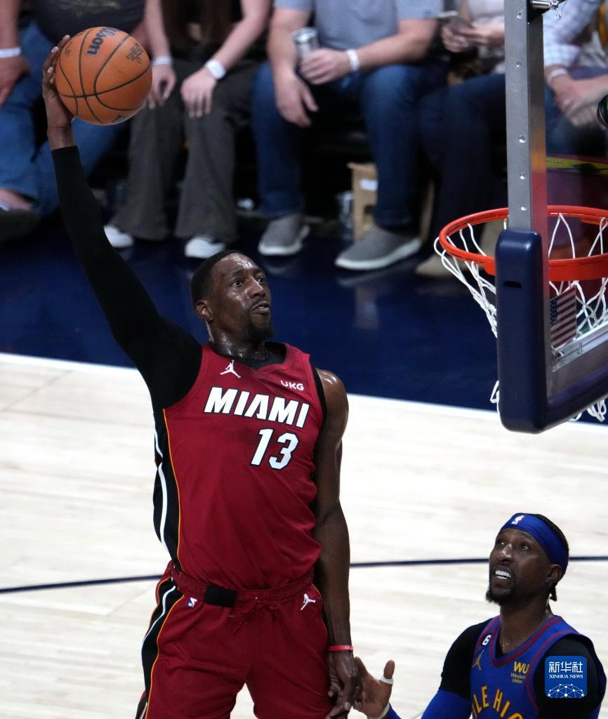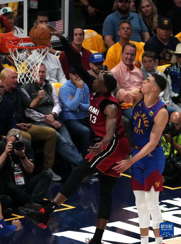 6月1日,热火队球员巴姆·阿德巴约(左)在比赛中扣篮。新华社记者 吴晓凌 摄