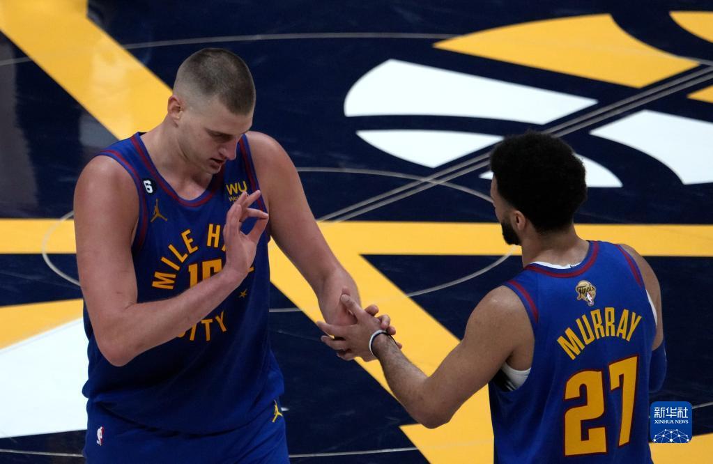 6月1日,掘金队球员尼古拉·约基奇(左)在比赛中与队友贾马尔·穆雷庆祝。新华社记者 吴晓凌 摄