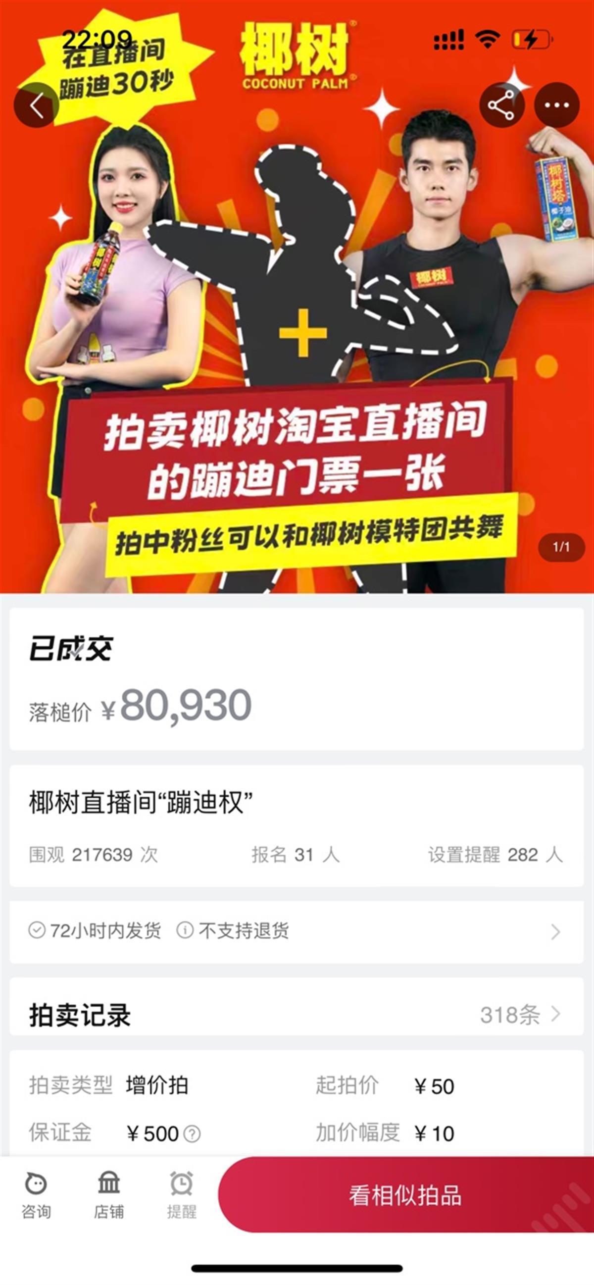 拍卖从6月1日19:00开始,数万名“吃光网友”慕名而来齐聚淘宝拍卖,看看与椰树男团跳舞的机会将花落谁家。
