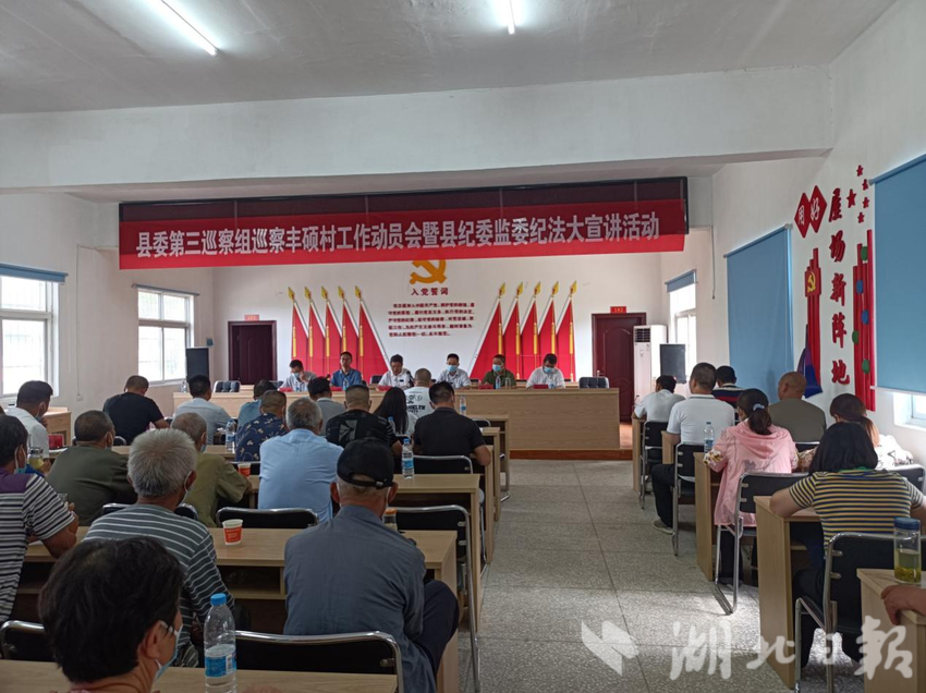 5月29日下午,孝昌县委第三巡察组联合县纪委监委,在丰山镇丰硕村召开巡察工作动员会暨纪法大宣讲活动。县委第三巡察组全体成员,县纪委监委机关干部朱黎明,丰山镇党委副书记马刚,丰硕村、丰新村、丰山村“两委”干部,11村(社区)“三员”及部分党员、群众代表等共同参与此次活动。