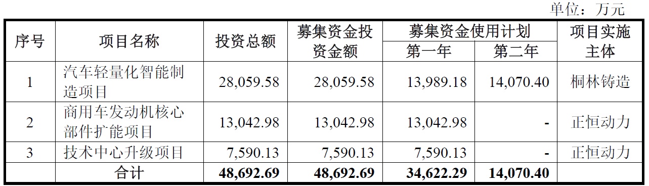 招股书显示,正恒动力拟募集资金48,692.69万元,分别用于汽车轻量化智能制造项目、商用车发动机核心部件扩能项目、技术中心升级项目。