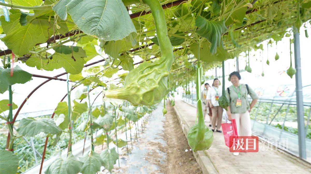 与鹤首“一棚”之隔的是不同形态的绿色肉丝瓜,其中最大的“亮丝瓜”因为口感更“柔坨”而成为现场被咨询最多的丝瓜品种。