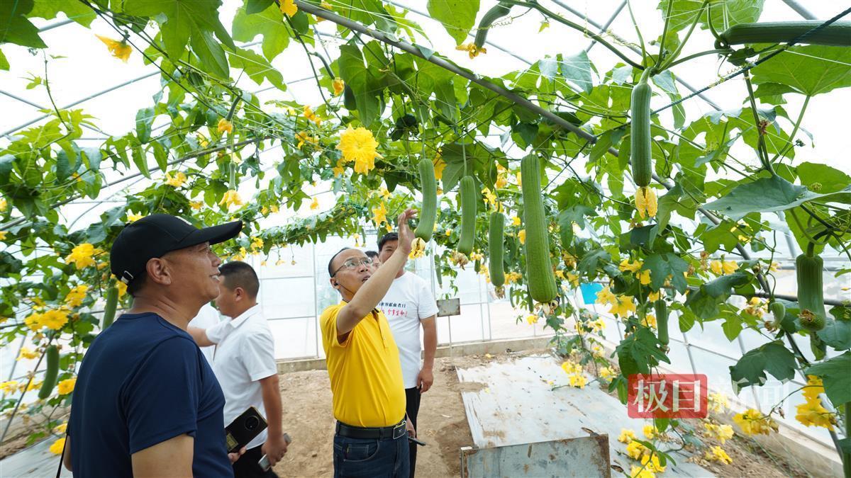 极目新闻记者走进棚内仔细观察这一群挂在蔓藤上的奇特植物,发现尽管它们的形态大致相同,但其中也有不少株果实“弯曲”得有自己独特的个性:这种名为“鹤首”的葫芦类蔬果有一根长长的“尾巴”从蔓藤上垂吊下来,硕大的果实则犹如一颗结实而不规则的绿色椭圆形球体悬空而生,摸上去比较厚实。