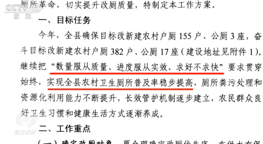 央视网消息(焦点访谈):“小厕所、大民生”。厕所问题不仅关系农村人居环境的改善,也关系广大人民群众生活品质的提升。目前,全国农村卫生厕所普及率超过73%,“厕所革命”走向纵深。然而,记者在调查中发现,有些地区的厕改成绩很“亮眼”,厕改成效却很“扎眼”,这关乎百姓切身利益的大事儿,要经得起“回头看”、再检验。