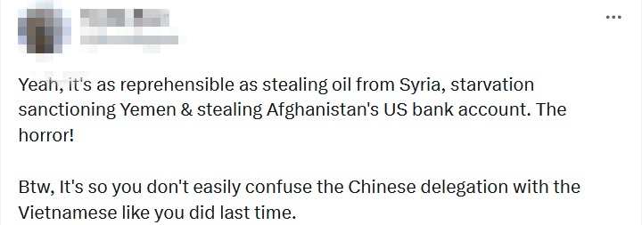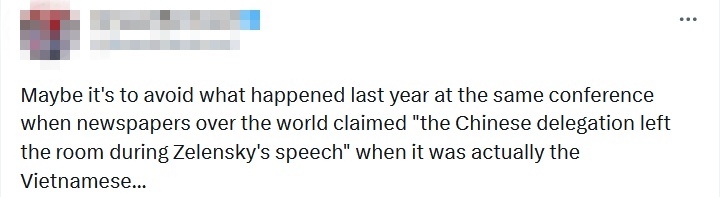 “是为了帮你这样的人区分中国人和越南人之间的区别”、“也许是为了避免去年在同一个会议上发生的事情,当时全世界的报纸都声称‘中国代表团在泽伦斯基演讲时离开了房间’,但实际上那是越南人”。