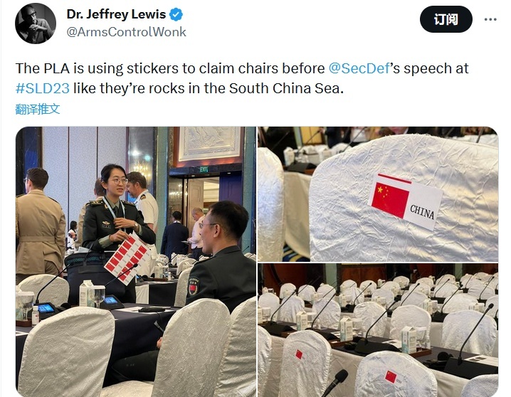 3日,美核武器专家杰弗里·刘易斯在推特上发布了几张椅背上贴有中国国旗的照片,攻击道:“在美国国防部长演讲之前,中国解放军正在用贴纸争夺椅子,就像它们是南海的岩石一样。”
