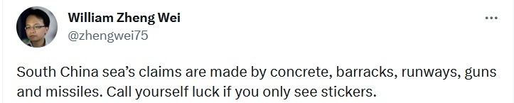 他试图给刘易斯讲一个道理:“南海的主权是由混凝土、营房、(机场)跑道、枪支和导弹提出的。如果你只是看到贴纸,应该觉得幸运。”