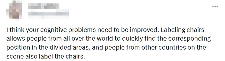 “我认为他们只是想确认一下应该坐在哪儿”、“我认为你的认知问题需要改善。给椅子贴上标签可以让世界各地的人在划分的区域里快速找到对应的位置,现场其他国家的人也给椅子贴上标签”。