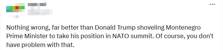 “(中方)这样没什么错,”有人怼脸讽刺刘易斯双标,“这可跟特朗普在北约峰会上一掌扒拉开黑山总理没得比。当然,你对这事肯定就没什么意见了。”