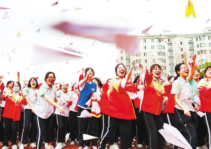 6月2日,襄阳五中高三学生在操场上放飞写有自己心愿的纸飞机。