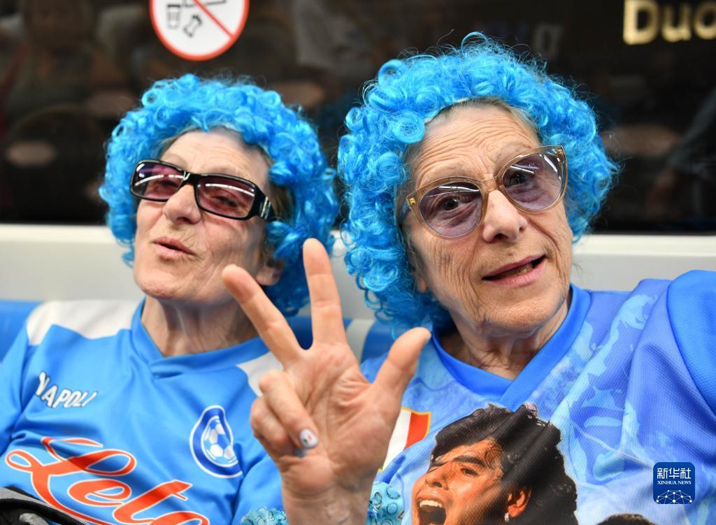 6月4日,两名老者在意大利那不勒斯庆祝球队夺冠。新华社记者 金马梦妮 摄