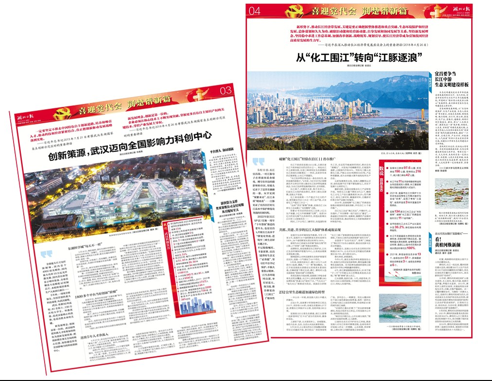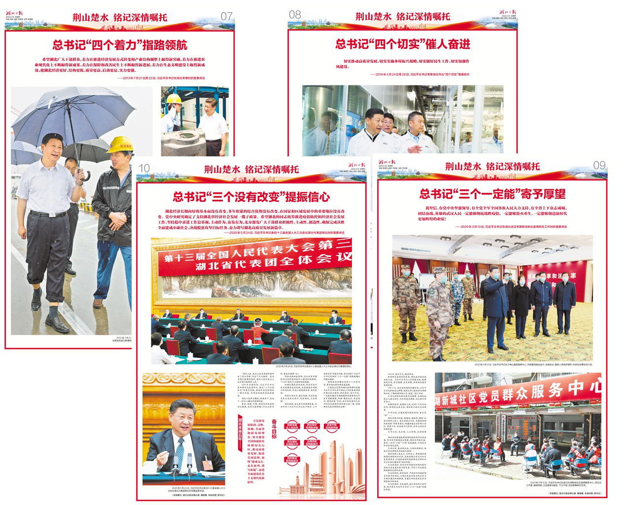 浓墨重彩做好习近平总书记为新时代湖北改革发展把脉定向、指路领航报道。湖北日报推出“光辉足迹,总书记来过咱这里”“总书记的‘长江嘱托’”等系列报道,《跟着总书记看中国:照片背后的湖北故事》《总书记指挥我们打好疫情防控战》等融媒产品,持续深入宣传贯彻落实习近平总书记关于湖北工作的重要讲话和重要指示批示精神,全网总阅读量过8亿。2022年6月28日,习近平总书记再次考察湖北武汉。湖北日报组织18名记者回访总书记考察现场,推出“总书记的荆楚足迹”系列报道,全面报道总书记的湖北之行;推出“践行嘱托的湖北实践”专栏和“领袖嘱托情暖荆楚”系列反响报道,全方位呈现湖北贯彻落实的生动实践。