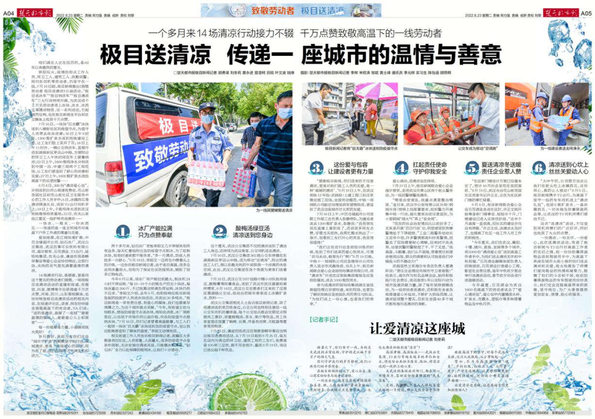 聚焦2022年8月湖北高温干旱灾害天气影响,湖北日报推出“全力以赴 抗旱减灾”“打好打赢抗旱减灾硬仗”“离不开的热岗”专栏和《多措并举解荆楚之“渴”》等系列评论,宣传全省党员干部冲锋在前、带领群众共抗旱情的鲜活故事,呈现一线职工战高温斗酷暑、抗旱减灾的奋斗场景。